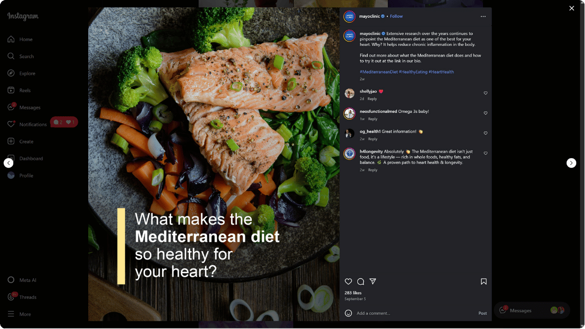 Mayo Clinic creates health content about principles that don’t change with health trends. Their content about topics like “What makes the Mediterranean diet so healthy?” addresses research-based nutrition science.