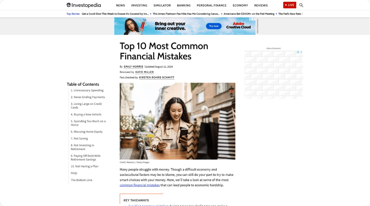 Investopedia’s financial guide addresses money problems that never go away. They cover universal issues like overspending, credit card debt, and lack of emergency savings.