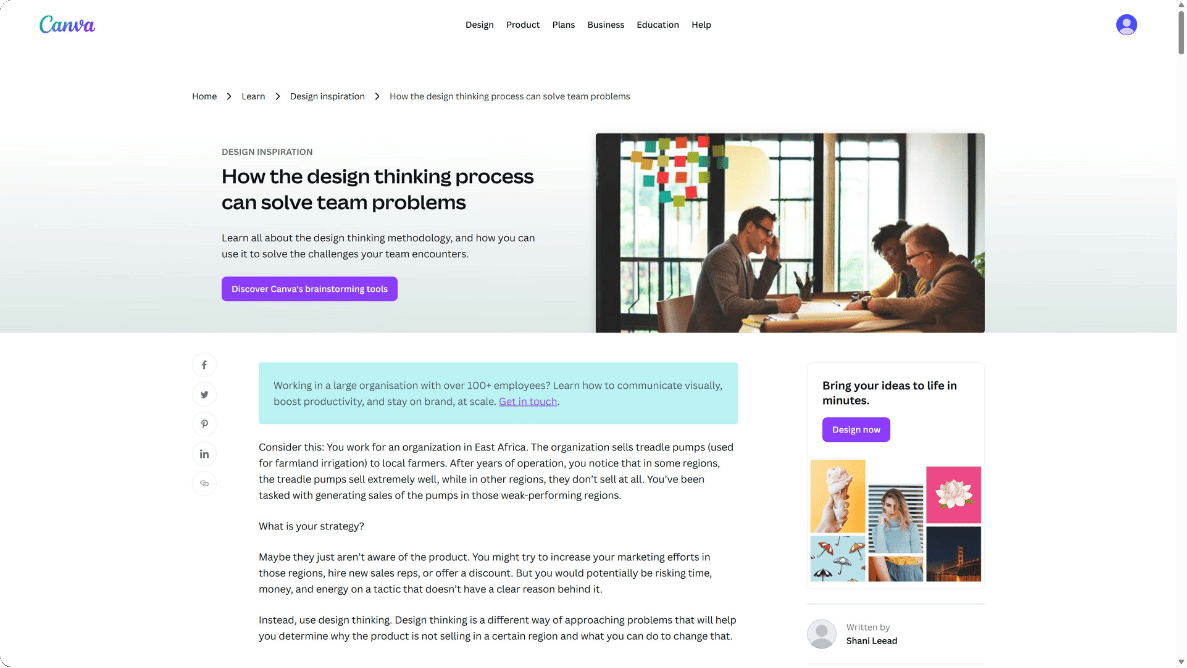 Canva’s design guide teaches a problem-solving method that works in any industry. Their five steps help fix business problems: understand users, find problems, think of ideas, make samples, and test them.