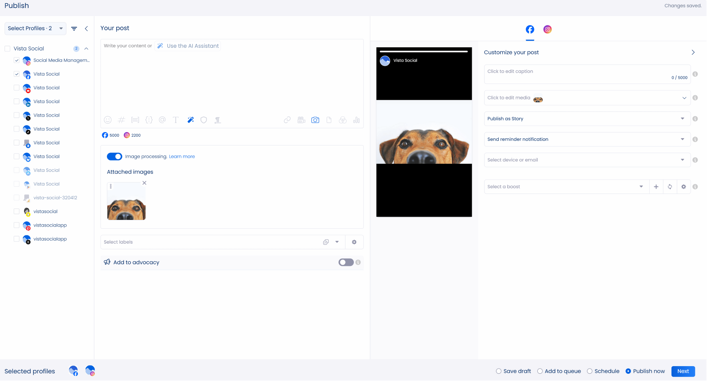 Select your client’s linked account and create and schedule the Facebook Story poll on the Vista Social web version. When you’re done creating your client’s Story, go to the option that lets you choose your device (the phone you used to log into the Vista Social app).