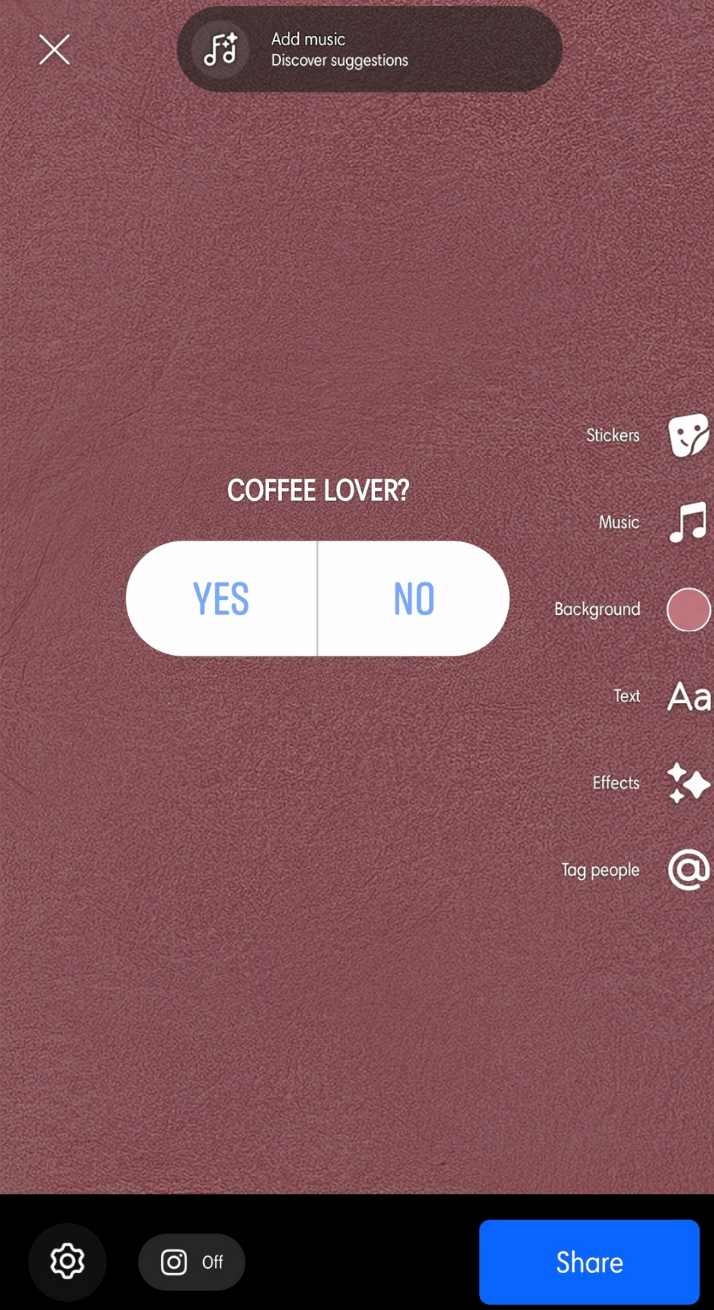 Add photos, a relevant hashtag, background music, filters, your client’s Instagram URL (if you run the same poll on IG), and more.