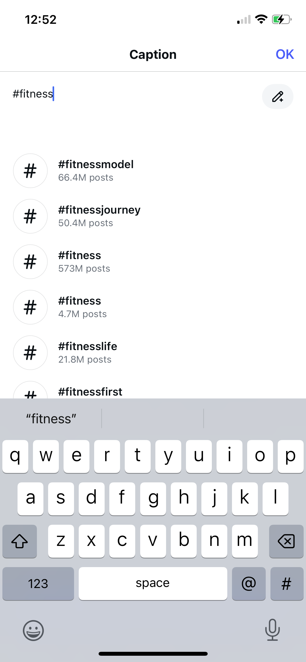 Plus, as you’re typing out your caption, you can input the # sign to get recommendations for hashtags. For example, below I started typing out #fitness to see similar hashtags I could use in my post.