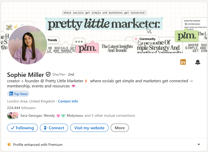 Sophie uses emojis strategically throughout her headline to match her brand personality. The lightning bolt, arrow, and heart emojis reflect Pretty Little Marketer’s signature style that her community expects. She also includes her value proposition (“where socials get simple”) right in the headline so people immediately understand what she offers.