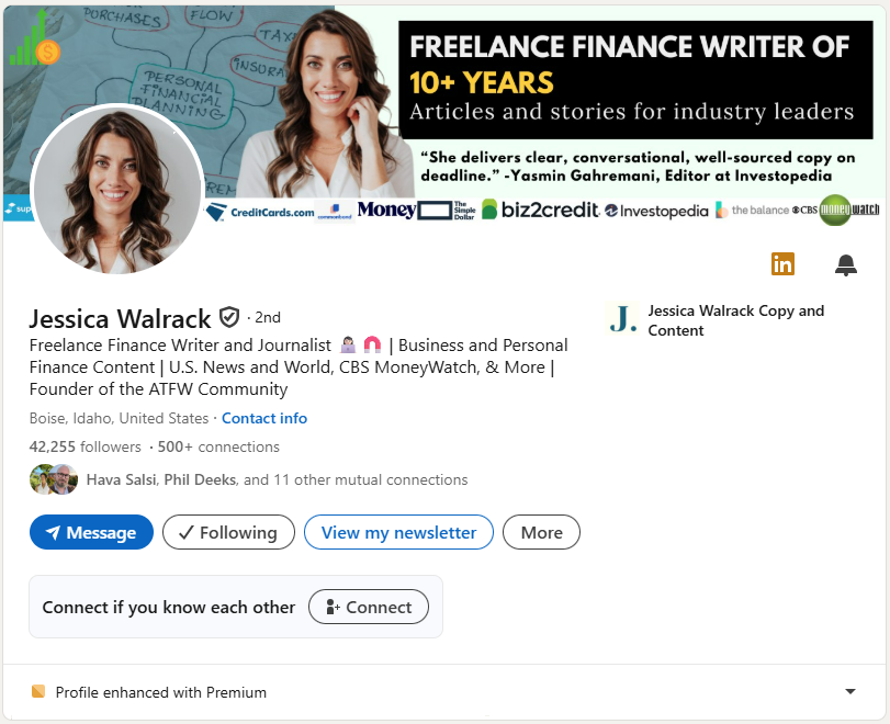 Get Started NowJessica includes her portfolio by mentioning prestigious publications she’s written for. The money and house emojis immediately signal her specialty area. She also promotes her community to show she’s building her own platform beyond client work.
