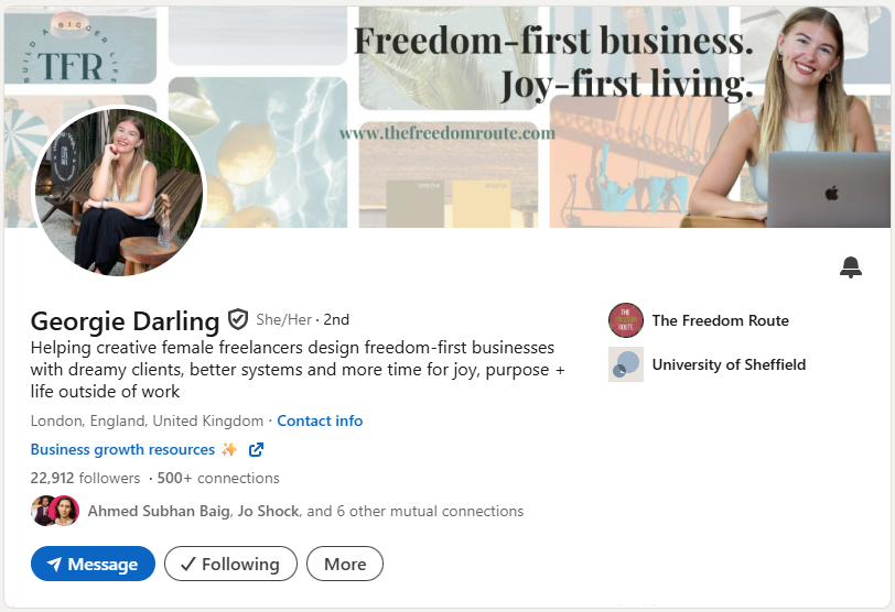 Georgie shares her mission clearly in her headline. She explains exactly who she helps (creative female freelancers) and what transformation she provides (freedom-first businesses). This approach attracts her ideal audience by speaking directly to their desires.
