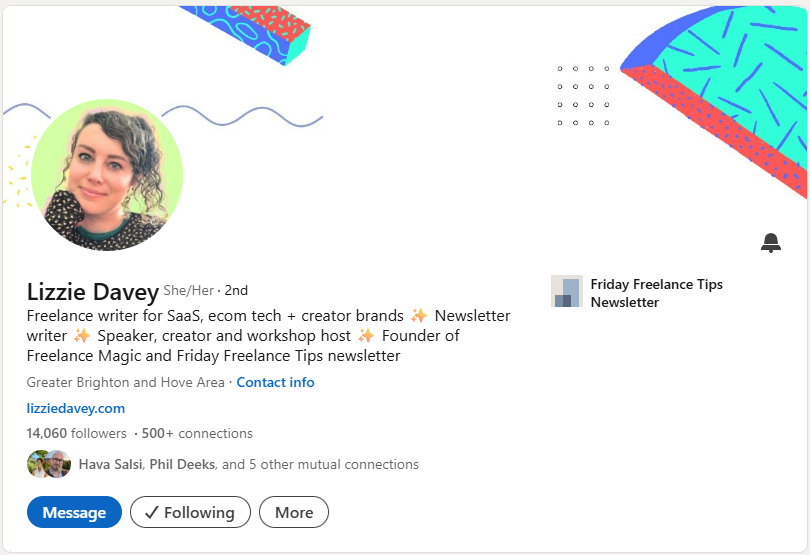 Lizzie shares multiple roles by listing all her different professional activities. The sparkle emojis add personality while maintaining professionalism. This approach shows the full scope of her expertise beyond just freelance writing.