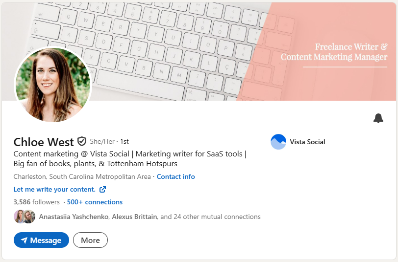 Alexus includes relevant personal details by adding “Dog Mom” with emojis, helping her connect with other pet lovers in her network. She explains what she does by positioning Vista Social as “the tool social media managers actually love using,” which serves as both a value proposition and product promotion.