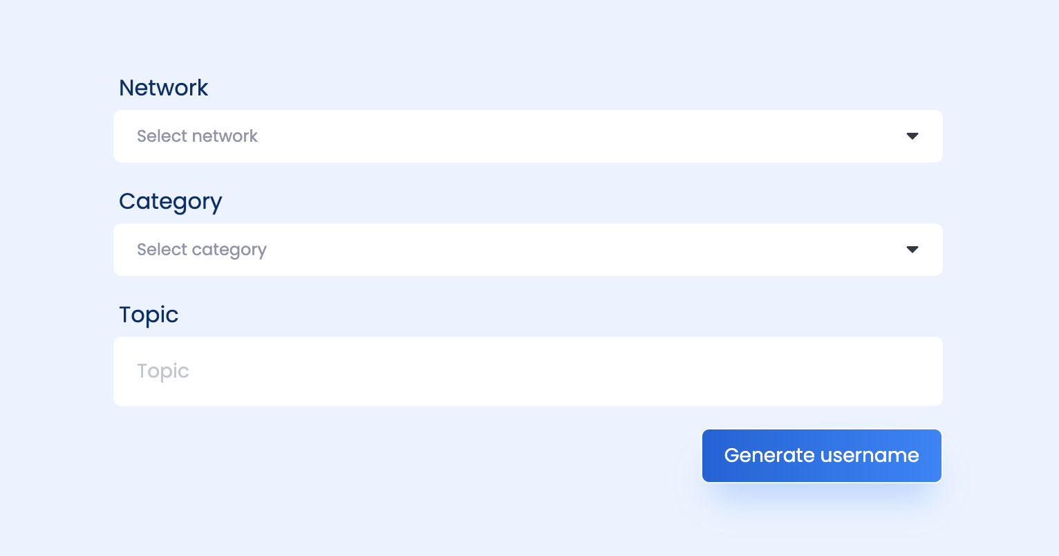 Select your social network, choose a category that your business fits in, and insert a topic you want your username to be centered around. Then boom, it gives you username suggestions within seconds.