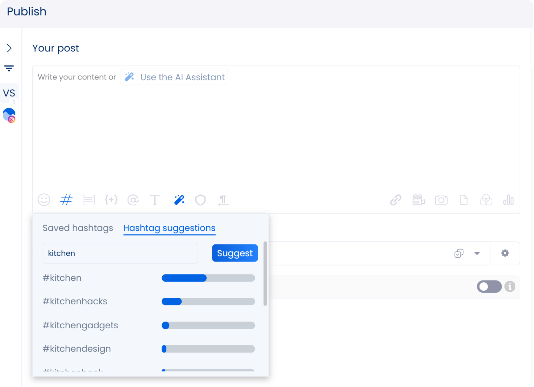 Use Vista Social to find relevant and popular hashtags in your industry, niche, or among your clients’ audiences. The social media management platform has an AI-powered hashtag generator that simplifies hashtag research and discovery.