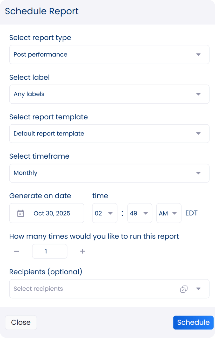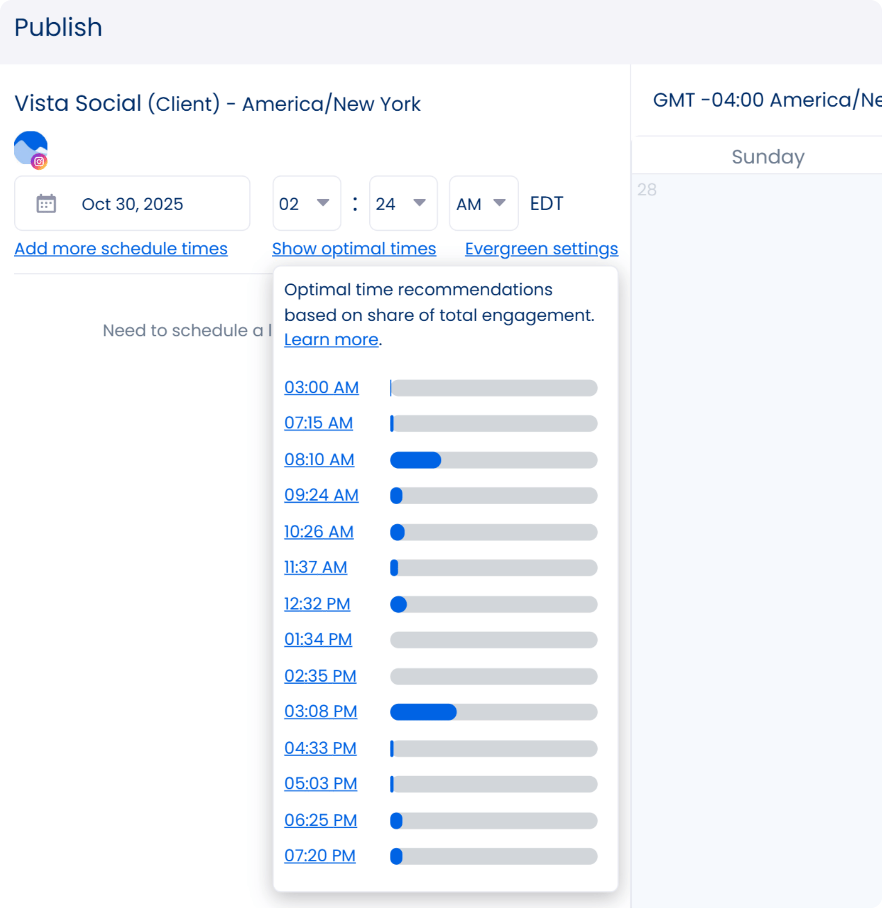 Finding optimal posting times is easy with Vista Social’s social media publishing feature. After creating and customizing your client’s post in the Publisher, you can set your preferred auto-posting schedule or choose from the platform’s suggested optimal publishing times.