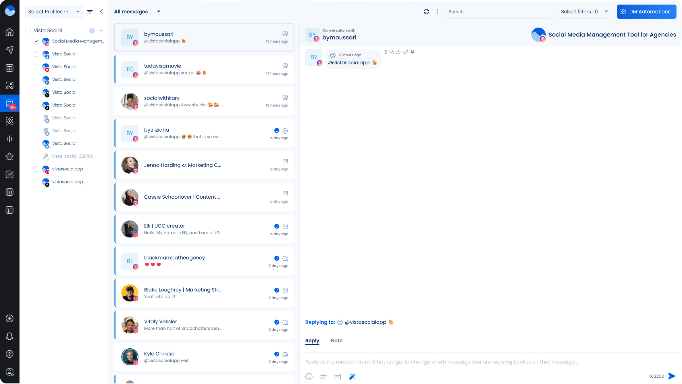 Engagement works best when it feels genuine. If you take a moment to reply thoughtfully or add a bit of humor, people notice and naturally feel more connected. Simplify the way you handle your clients’ social interactions with Vista Social’s social media engagement feature. It includes a unified Social Inbox where you can manage all client interactions from one place.
