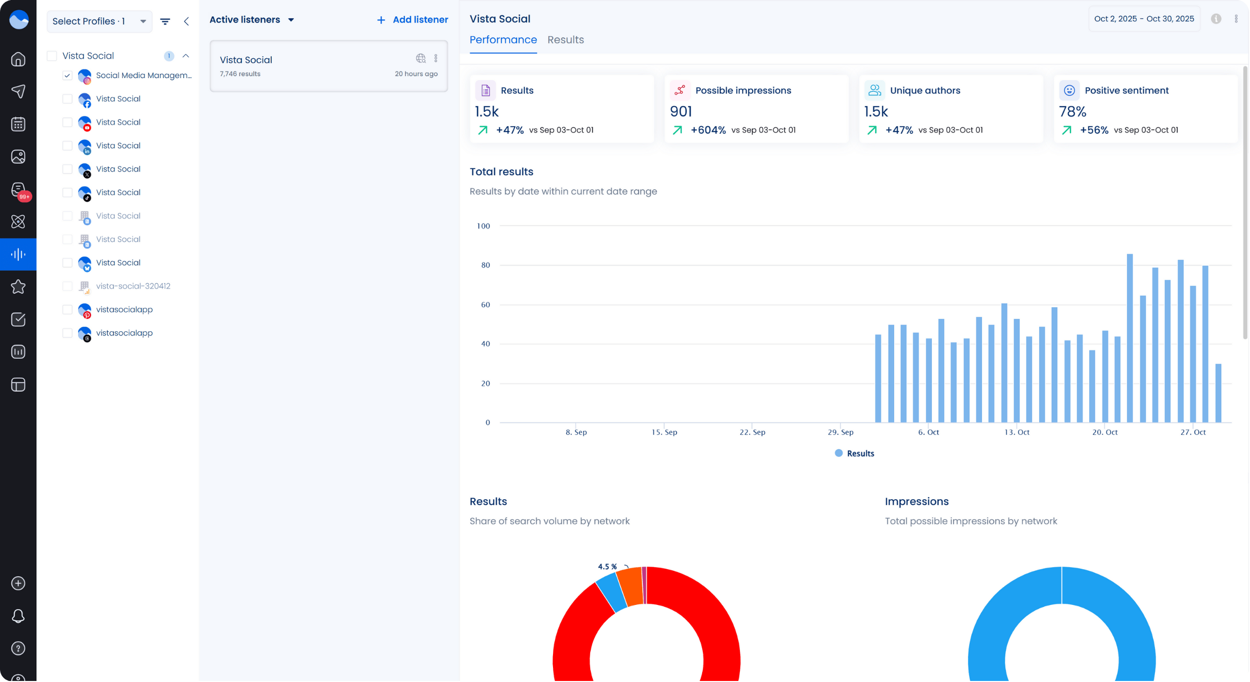The best place to start is to listen to what your clients’ followers are saying on social media through social listening. Use Vista Social’s social media listening feature to set up Listeners. The Listeners can track and pull conversations around your specified keywords or topics across your clients’ connected profiles.