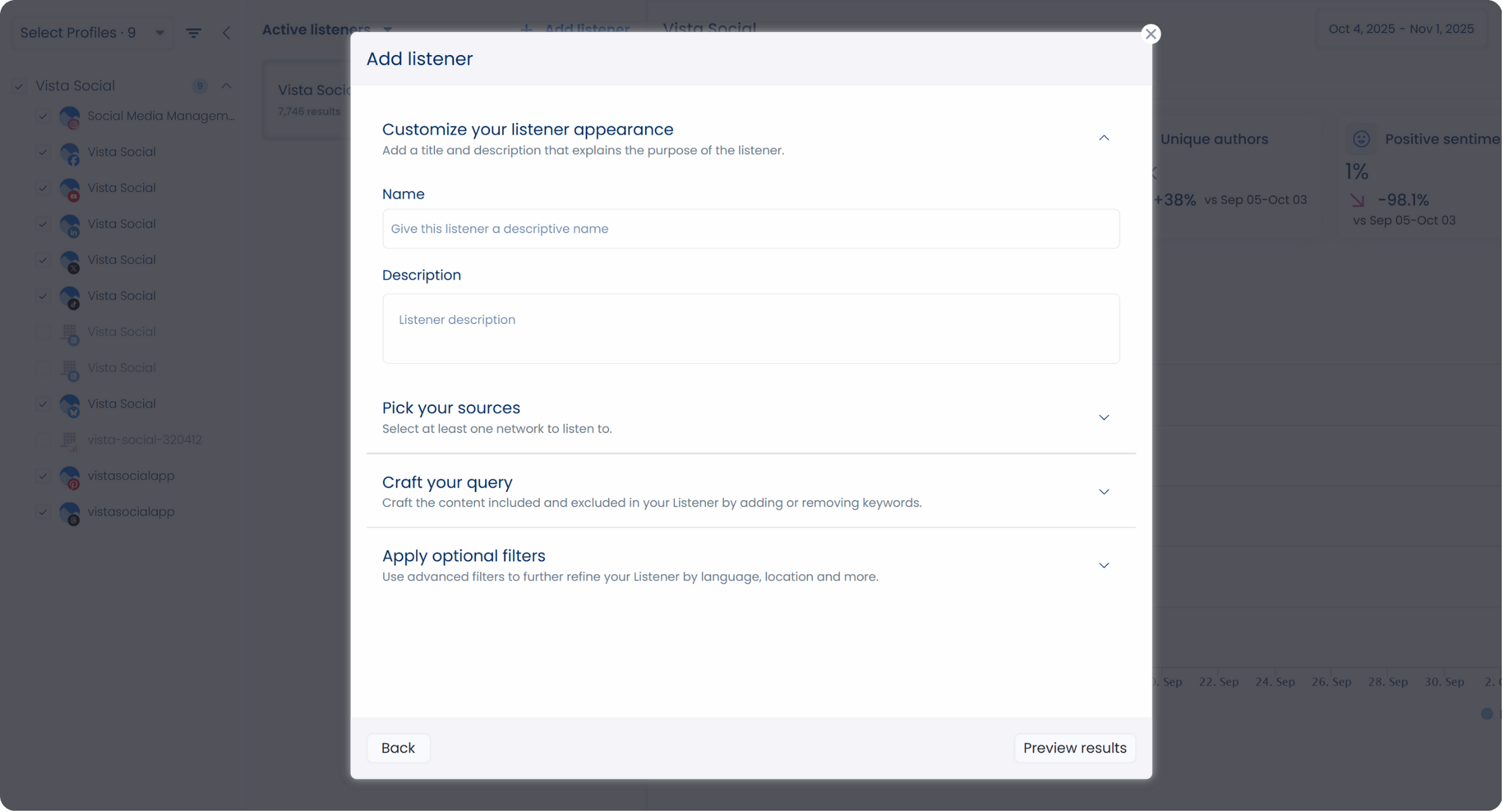 With Vista Social, you can set up Listeners to monitor brand mentions and keywords, including conducting competitor analysis across major platforms.