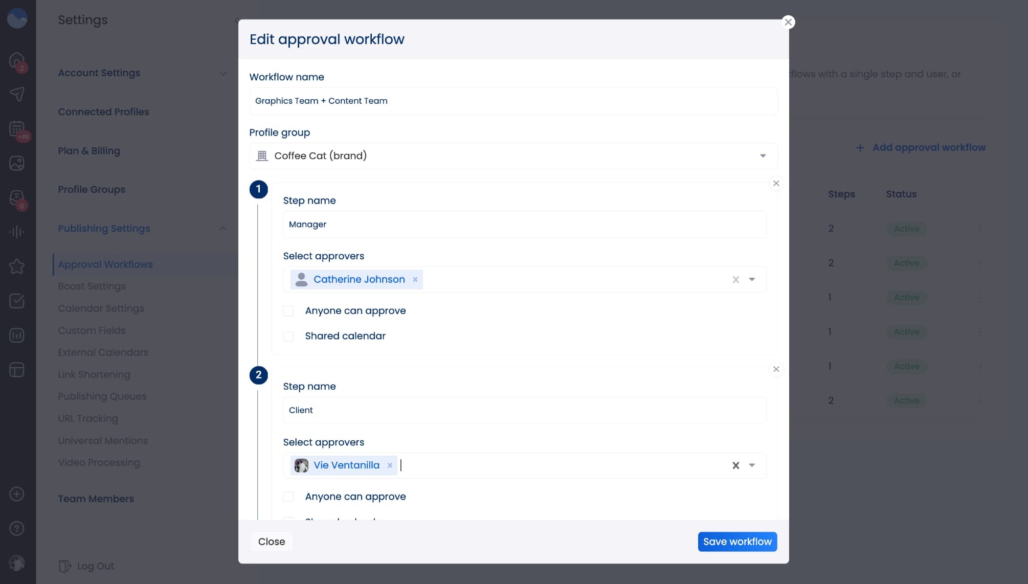 Vista Social lets you create your own approval workflow so you only include what you need. Go to Settings → Publishing Settings → Approval Workflows. A simple pop-up walks you through the setup so you can build a flow without bloat.