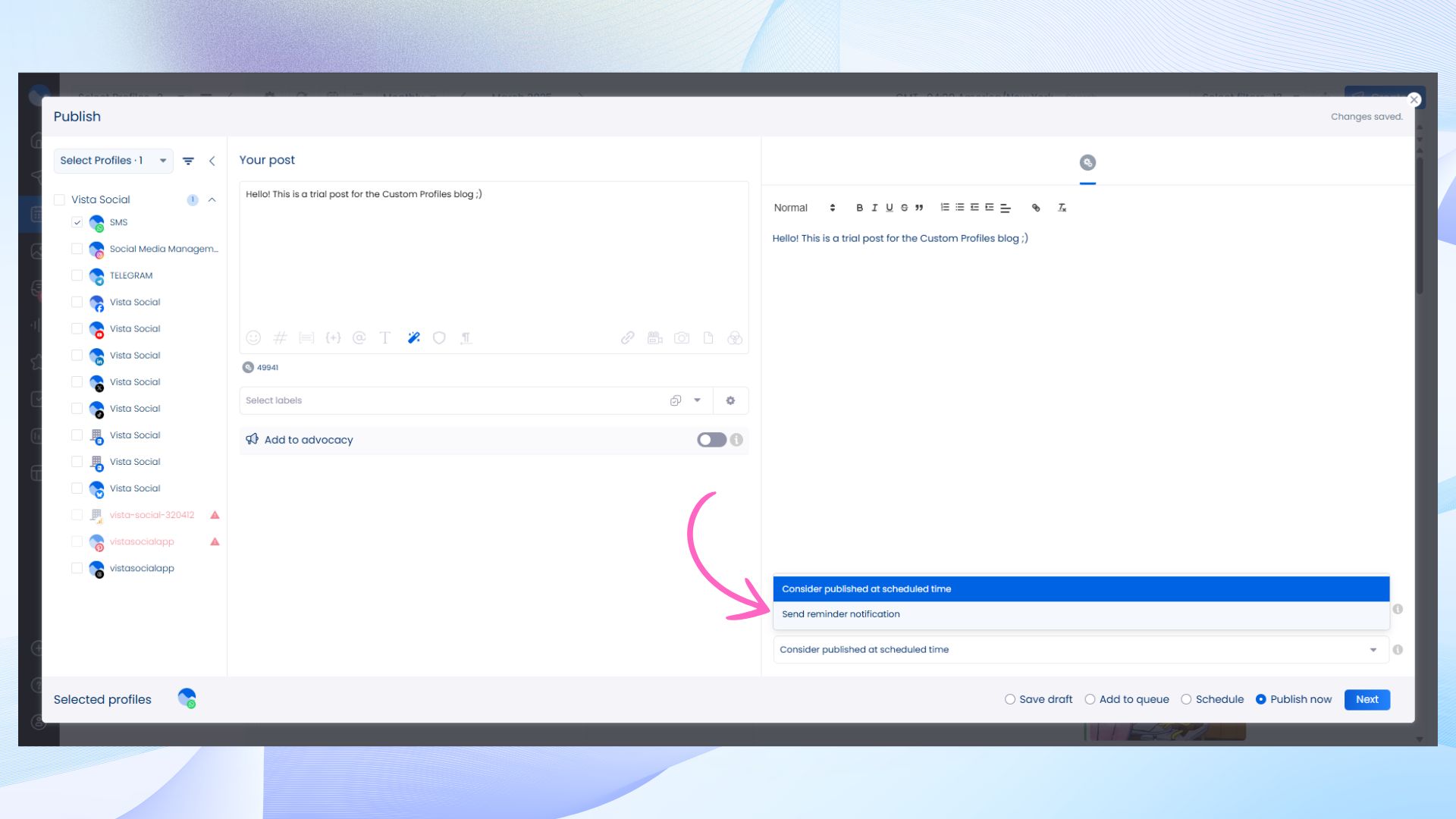 Not everything can be automated. Sometimes, a blog needs to be manually published, a report needs to go live, or a sales deck needs to be updated. With Custom Profiles, you can set reminders for these tasks just like you would for social posts. At the right time, Vista Social sends a notification to the right person, making sure everything stays on track.