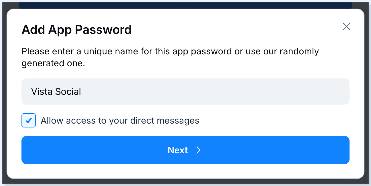 | Note: If you’d like to see Bluesky engagements in your Vista Social inbox, tick the box for ‘Allow access to your direct messages’. |