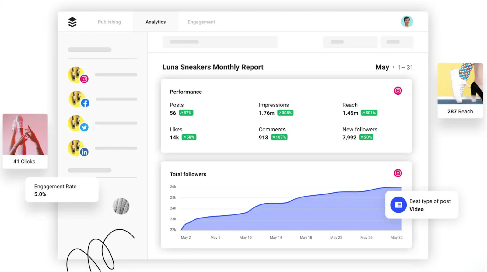 Buffer also offers dashboards to monitor reach, clicks, engagement, impressions, follower growth, and post performance.