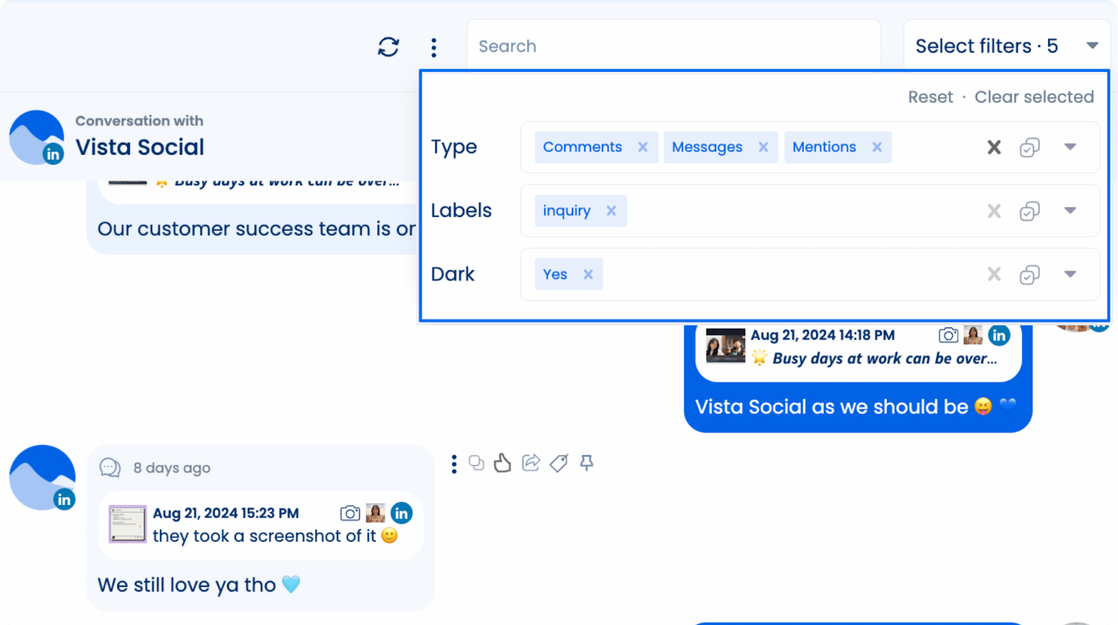 Vista Social’s Social Inbox brings all comments and messages from your connected profiles into a single stream, so you no longer have to jump between platforms to stay on top of conversations.