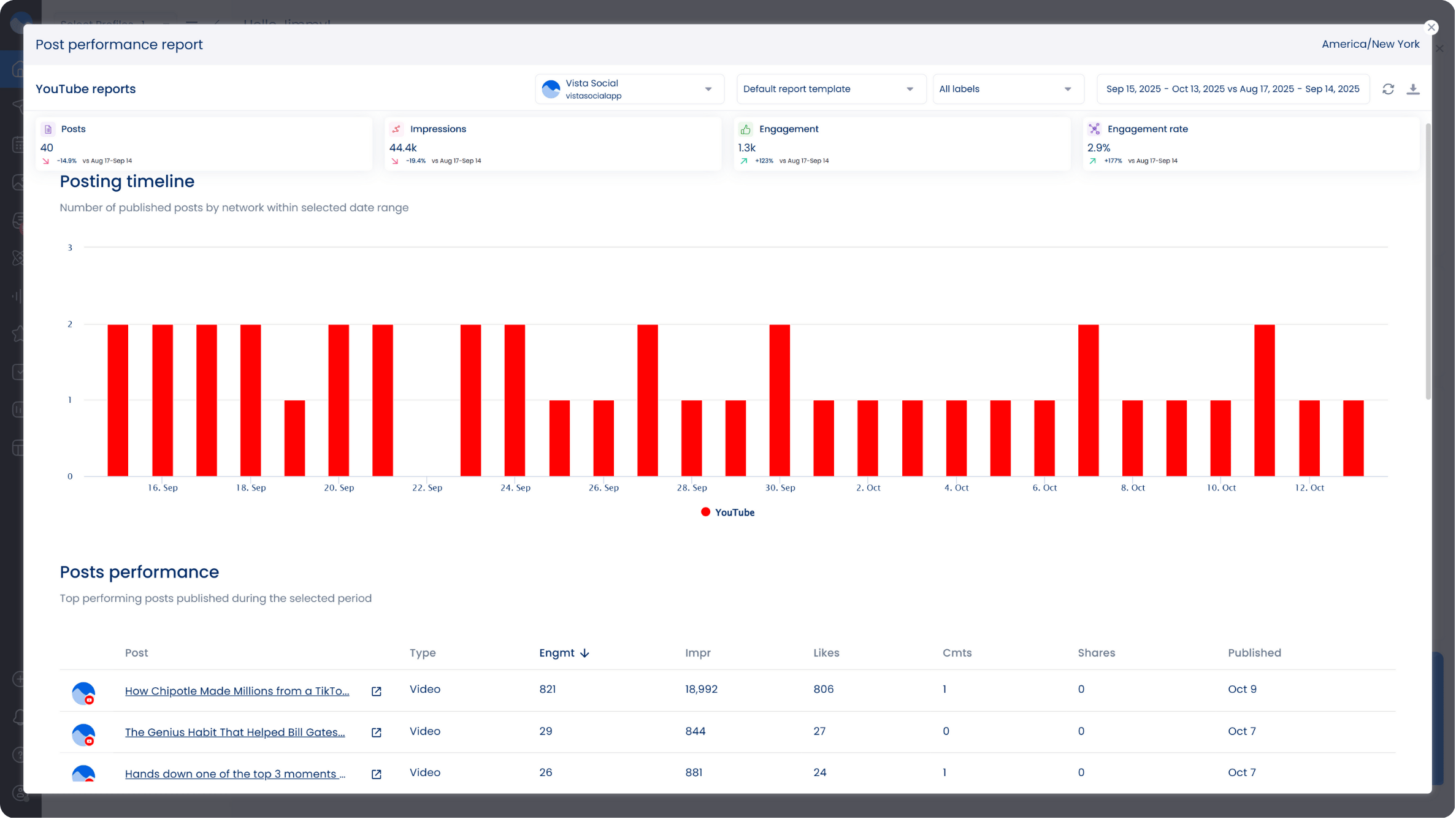 Once your videos go live, Vista Social analytics tracks performance like views, engagement, sentiment, and audience growth.